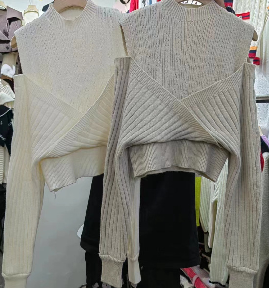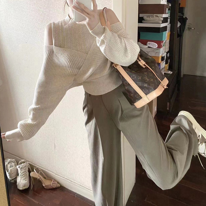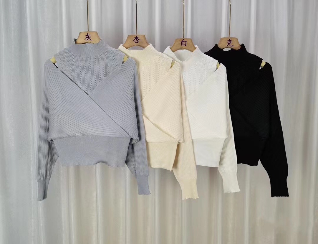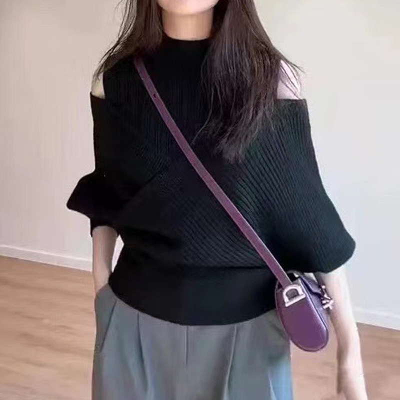Women's Half Turtleneck Off Shoulder Fake Two Pieces Hollow-out Knitted Sweater