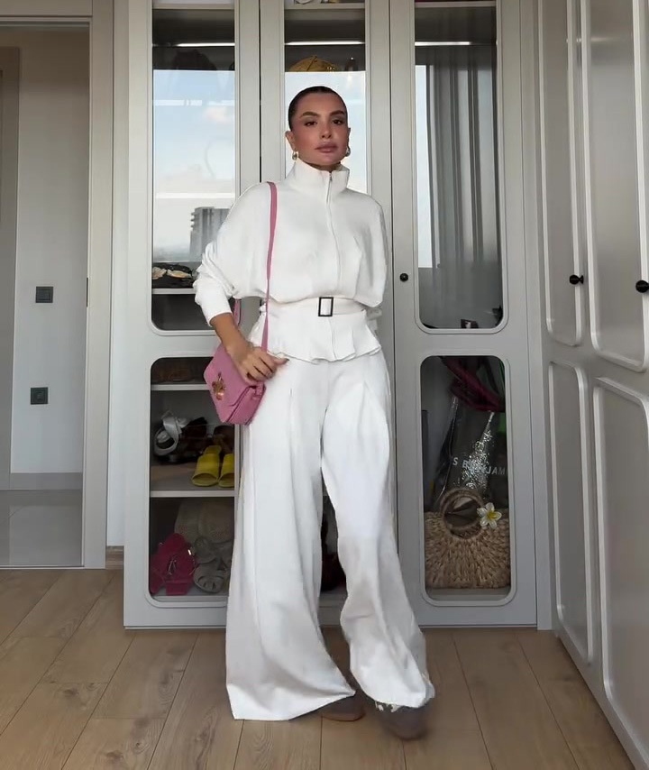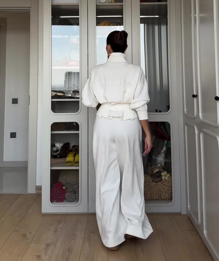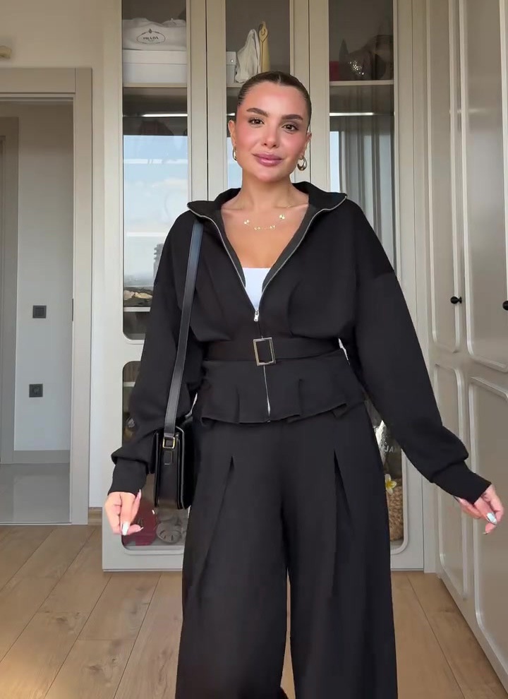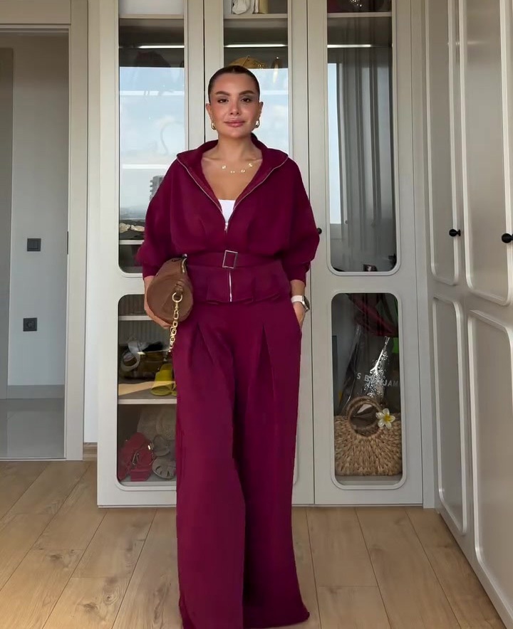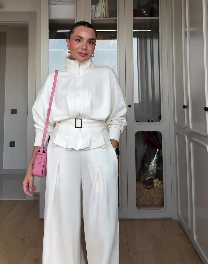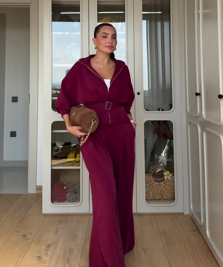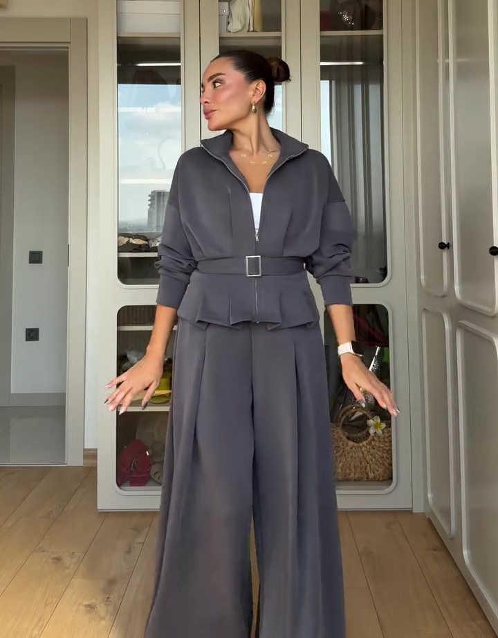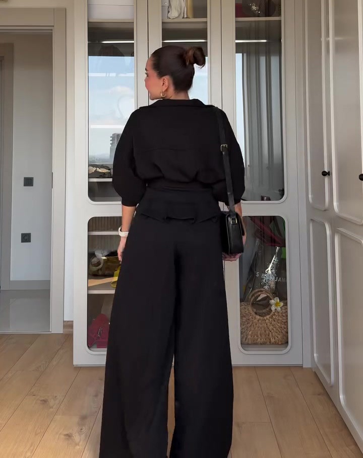 Women's Polo Collar Solid Color Waist Slimming Wide Leg Pants Suit